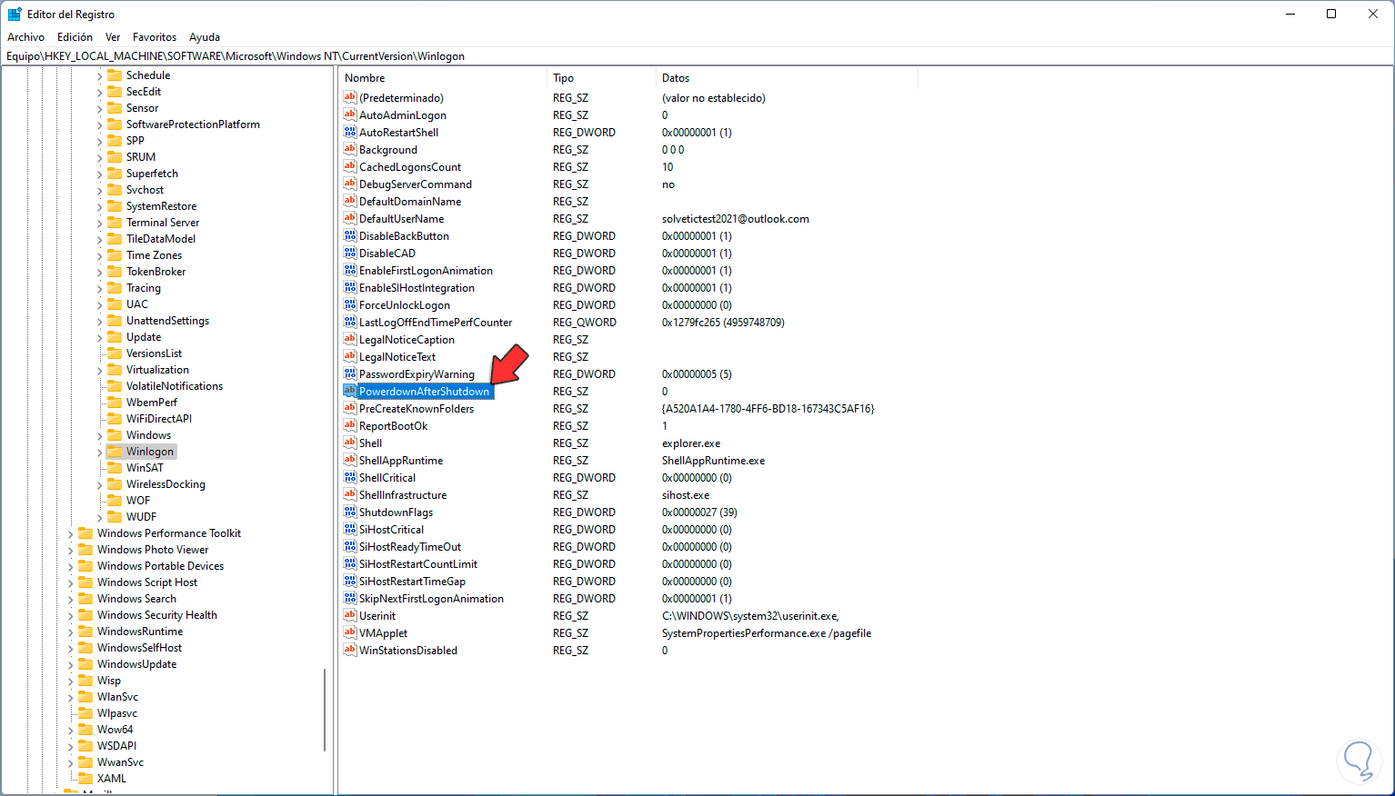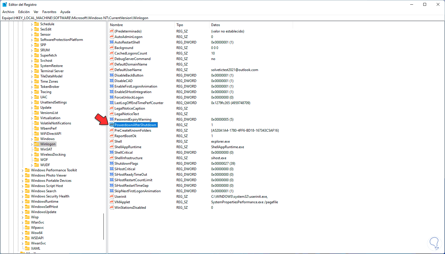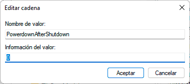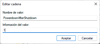 Damos doble clic sobre el valor "PowerdownAfterShutdown" para ver sus propiedades: