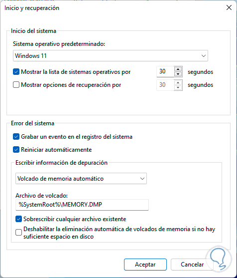 Allí desactivamos la casilla "Reiniciar automáticamente":
