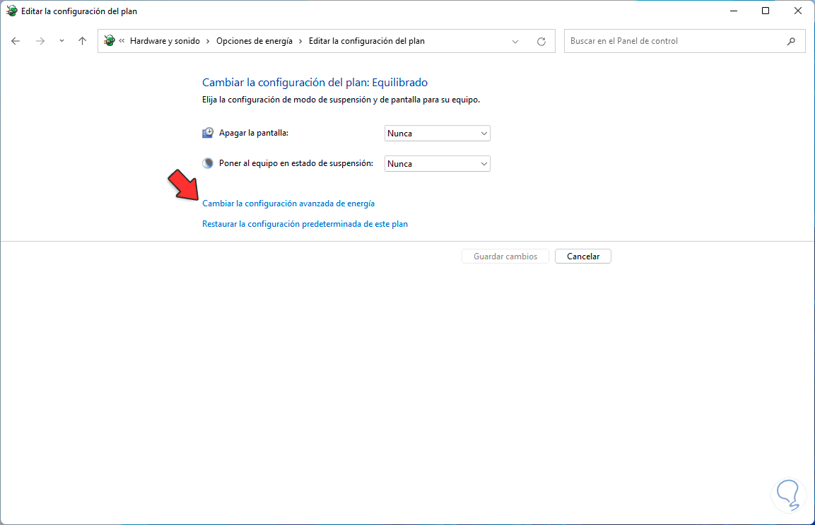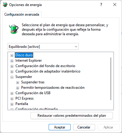 Damos clic en "Cambiar la configuración avanzada de energía" para ver lo siguiente: