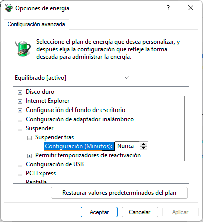 En "Suspender" establecemos "Nunca" en "Suspender tras":