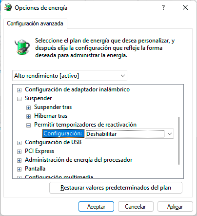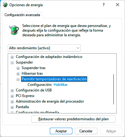 En otros equipos es posible ver la opción “Permitir temporizadores de reactivación”: