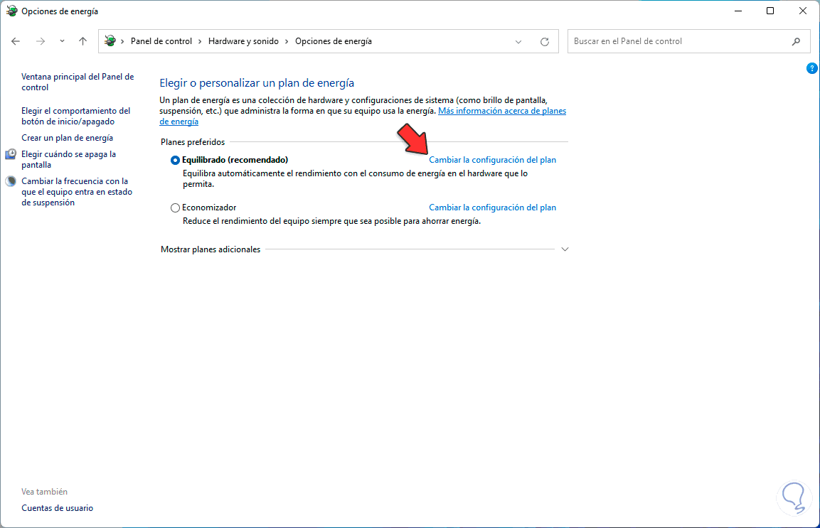En "Planes preferidos" damos clic en "Cambiar la configuración del plan" y tendremos las siguientes opciones: