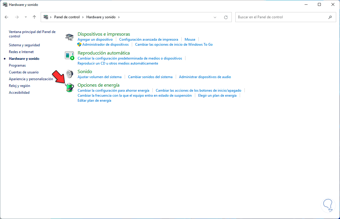 Luego veremos lo siguiente. Damos clic en “Opciones de energía” para que sea desplegado lo siguiente: