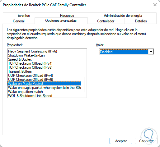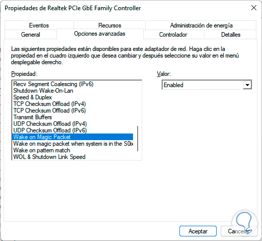 En la ventana emergente vamos a la pestaña "Opciones avanzadas" y allí seleccionamos la opción "Wake on Magic Packet":