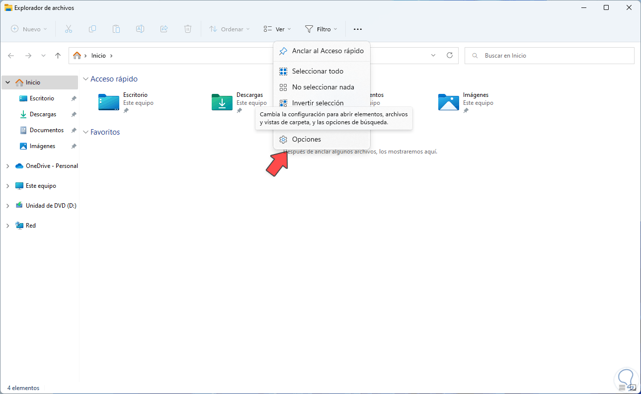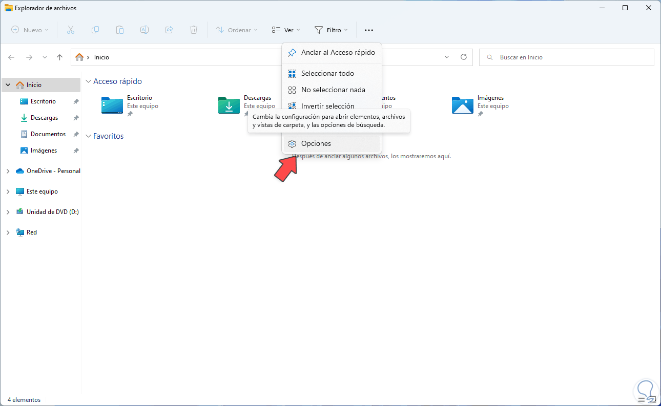 Ahora es posible que no deseemos que sean visibles no solo los archivos de Office.com sino todos los archivos y carpetas abiertas, para esto abrimos el Explorador de archivos y damos clic en "Ver más - Opciones":