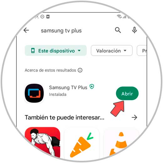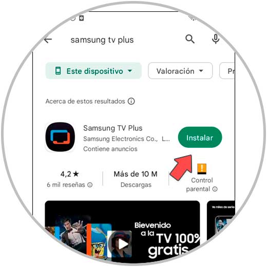 Lo primero que haremos será entrar en Google Play, y en el buscador escribimos Samsung TV Plus. Seleccionamos “Instalar” para instalar la App.