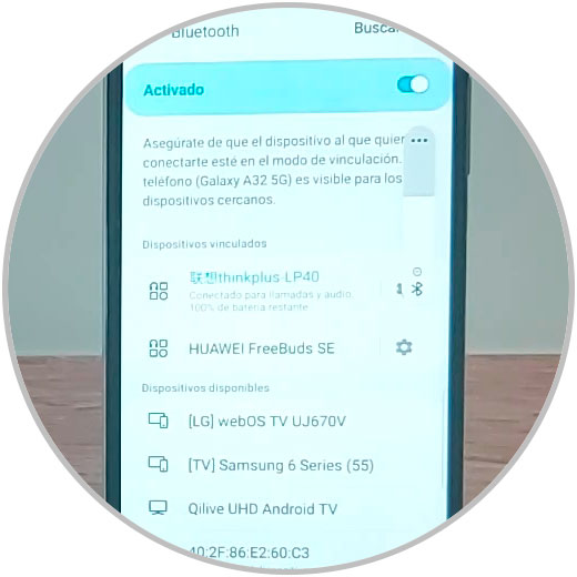 Ahora, el Bluetooth debe estar activado. En el apartado de “Dispositivos disponibles” debe aparecer la opción “ThinkPlus-LP40”. Pulsa sobre ésta.