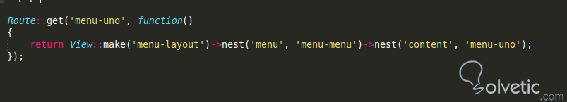 Ahora vamos a crear la vista menu-layout, para ello vamos a generar una archivo llamado menu-layout.php en la carpeta views de nuestra aplicación, si nos fijamos en routes creamos dos apartados uno llamado menu y otro llamado content estos deben estar en nuestro layout para que podamos mostrar el contenido ahí, además vamos a crear el CSS necesario para darle estilo a nuestro menú. Veamos cómo sería: