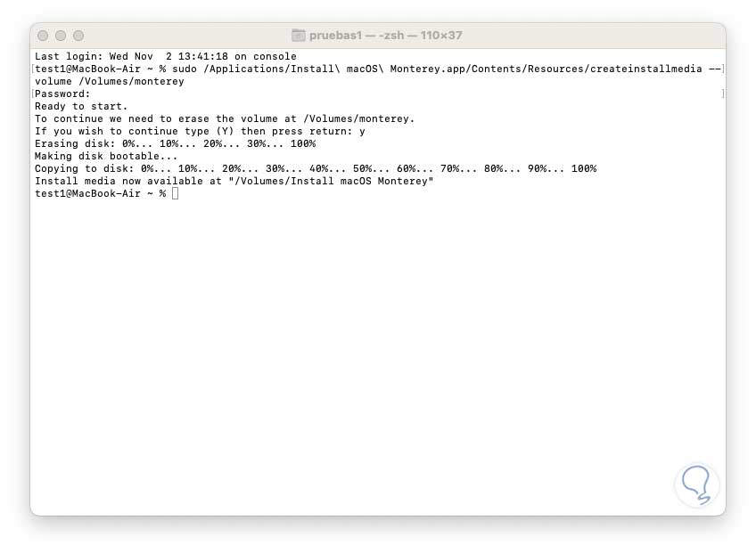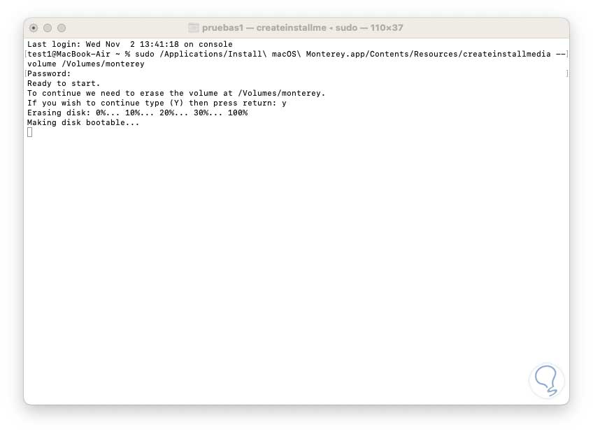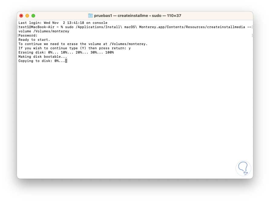 Ingresamos la letra "y" para confirmar el proceso y esperamos que se complete la creación de la USB de arranque de macOS Monterey: