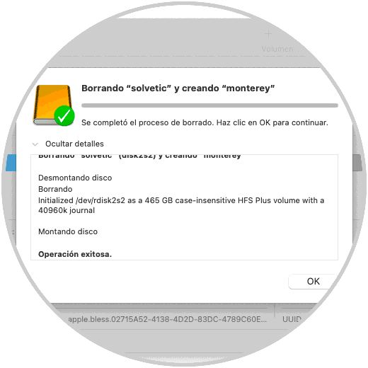 En la ventana desplegada asignamos un nombre, en el campo "Formato" establecemos la opción "Mac OS Plus (con registros)":