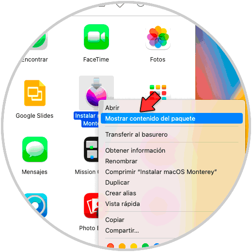 Ahora damos clic derecho sobre el instalador de macOS Monterey y seleccionamos la opción "Mostrar contenido del paquete":