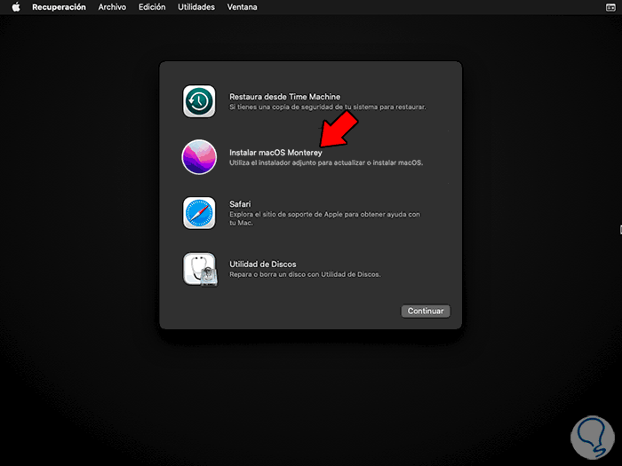 Seleccionamos el idioma de instalación de macOS Monterey, luego accederemos al menú de recuperación de macOS: