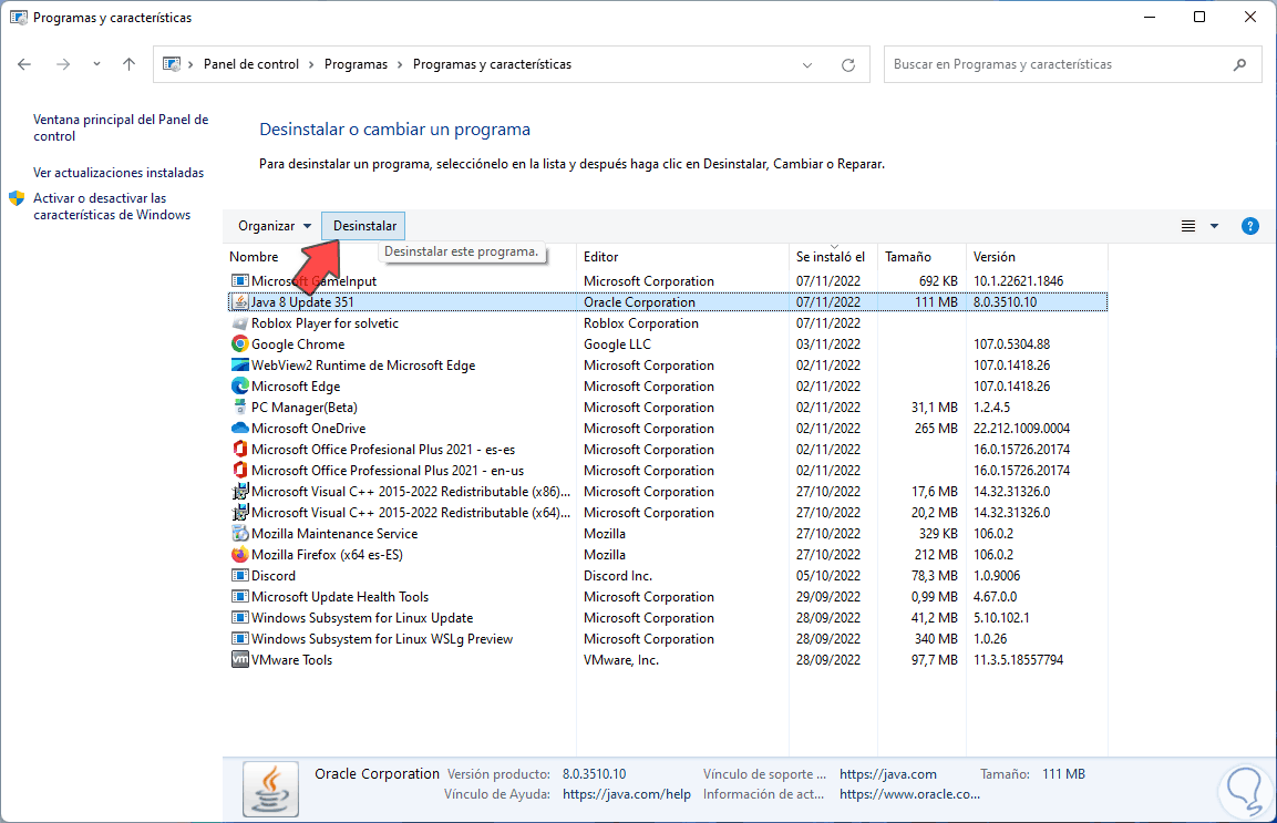 Damos clic en "Desinstalar un programa" y luego seleccionamos "Java":