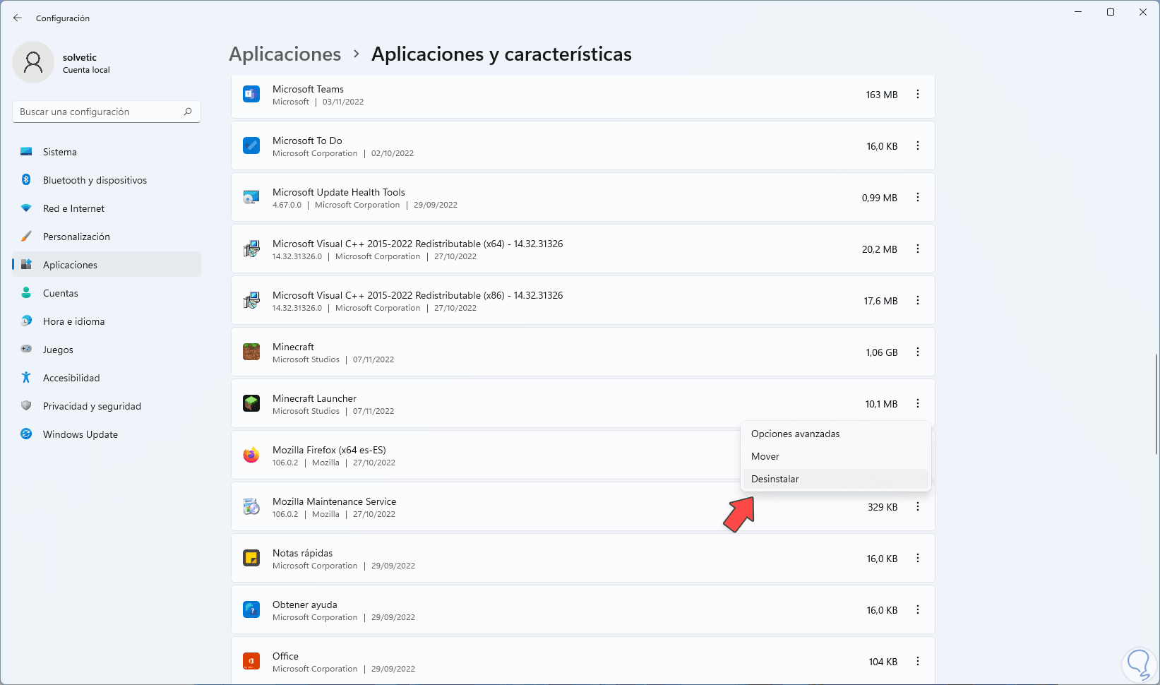 Una vez accedamos pulsamos en el menú contextual de Minecraft Launcher y seleccionamos la opción "Desinstalar":
