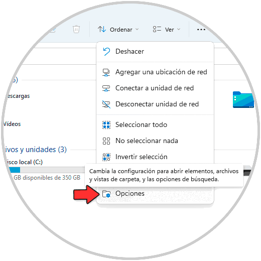 Para borrar la cache allí, abrimos el Explorador de archivos y damos clic en el menú "Ver más - Opciones":