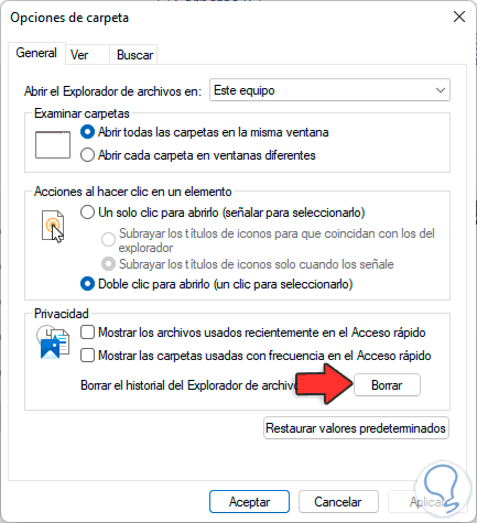 Se abrirá la siguiente ventana. En la sección "Privacidad" damos clic en "Borrar" y aplicamos los cambios.