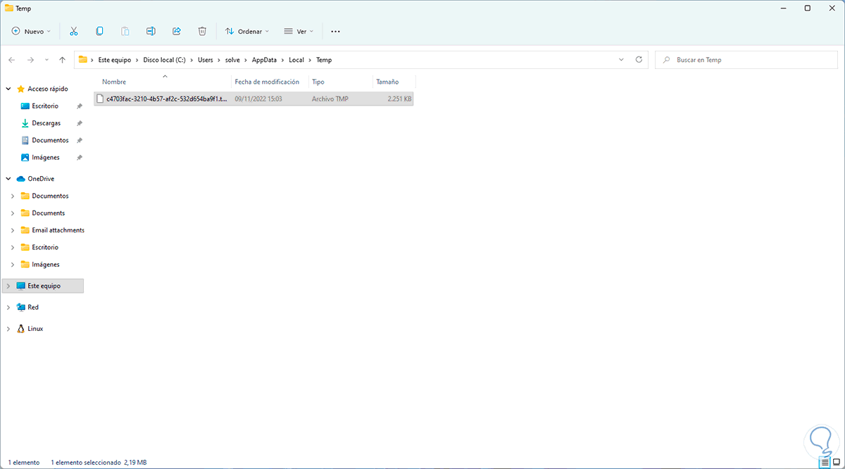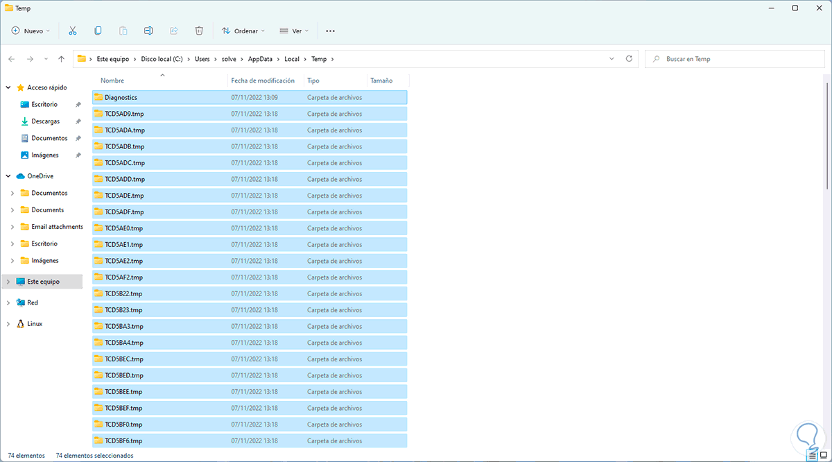 Sin lugar a dudas que los archivos temporales son una de las raíces de mas almacenamiento de cache en Windows 11, es algo que diariamente esta almacenando datos allí de modo que borrarlos ayudara a optimizar esta sección.