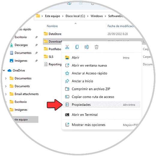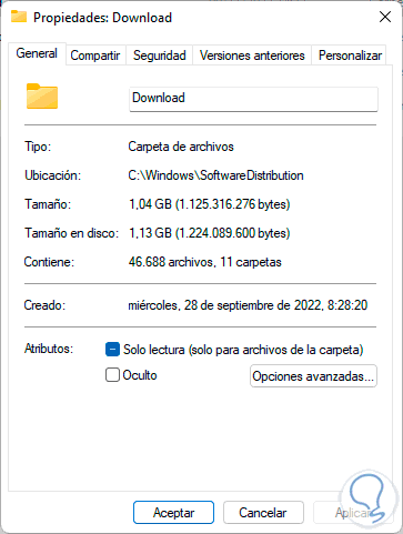 C:\Windows\SoftwareDistributionDamos clic derecho en la carpeta "Download", seleccionamos "Propiedades" para ver su tamaño: