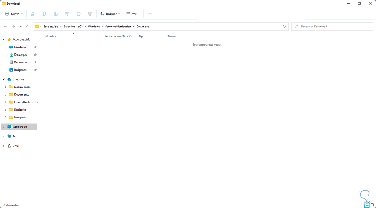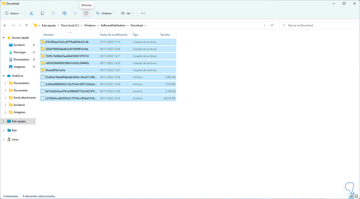 Borramos el contenido de la carpeta seleccionando todo el contenido y dando clic en “Eliminar”: