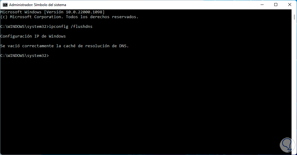 Ejecutamos "ipconfig /flushdns":