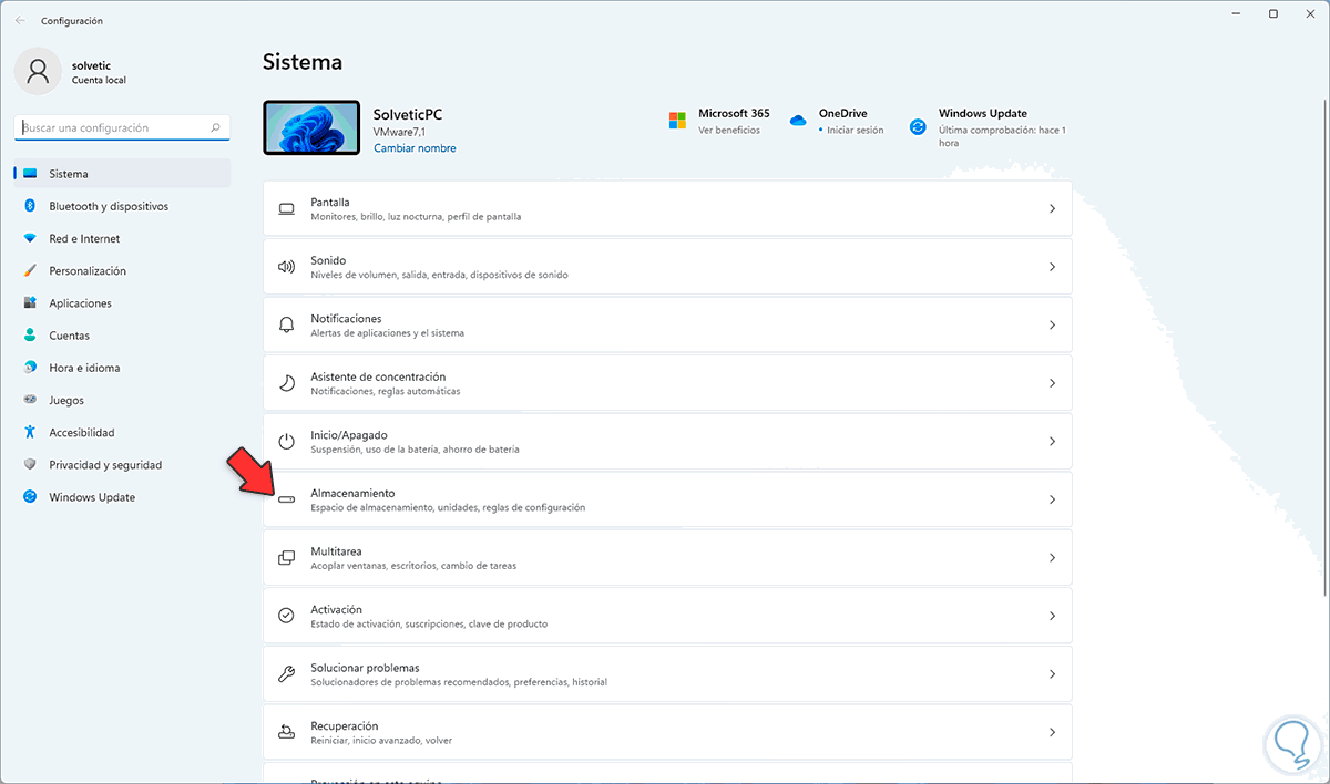 Para su uso vamos a "Inicio - Configuración - Sistema - Almacenamiento":