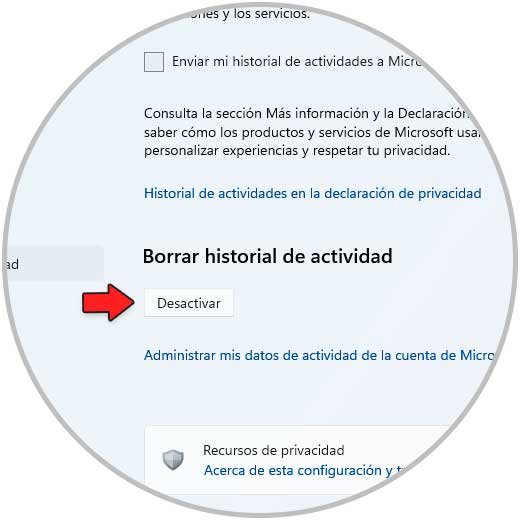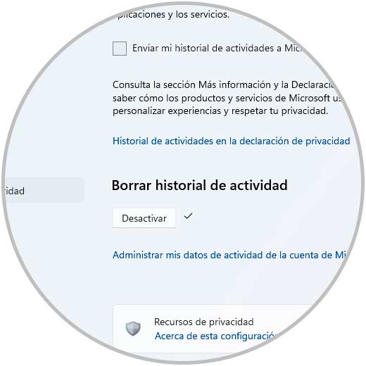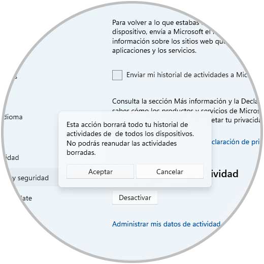 Damos clic en "Desactivar" en "Borrar historial de actividad" y se abrirá la siguiente ventana: