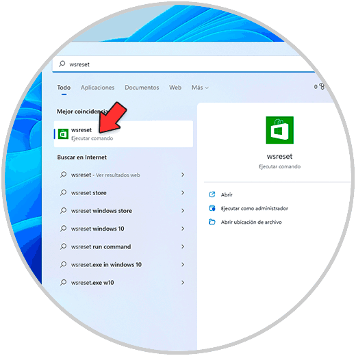 En el buscador ingresamos "wsreset" y debemos ejecutar el comando: