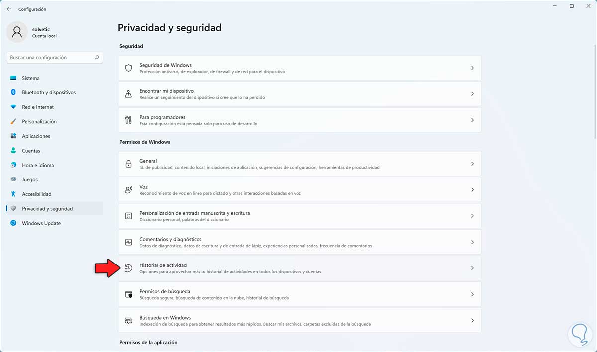 Para borrarla vamos a "Inicio - Configuración - Privacidad y seguridad - Historial de actividad":