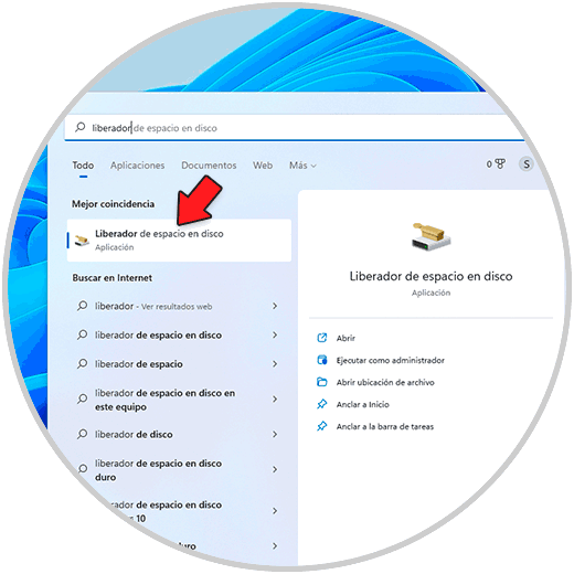 Para su uso en el buscador de Inicio ingresamos "liberador" y seleccionamos "Liberador de espacio en disco".
