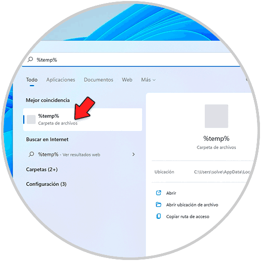 En el buscador de Inicio ingresamos "%temp%" y abrimos la carpeta: