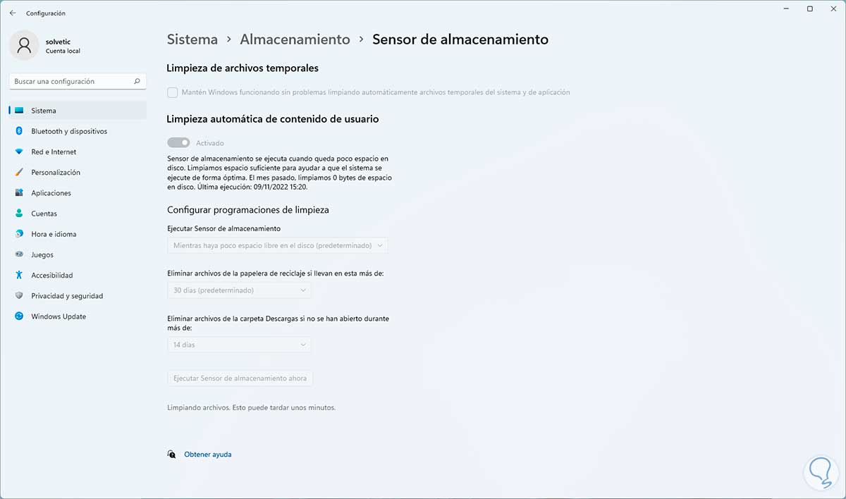 Damos clic en "Ejecutar Sensor de almacenamiento ahora" y esperamos que finalice: