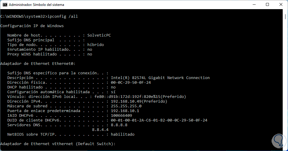 Si ejecutamos “ipconfig /all” podemos ver detalles completos de la asignación que hemos realizado: