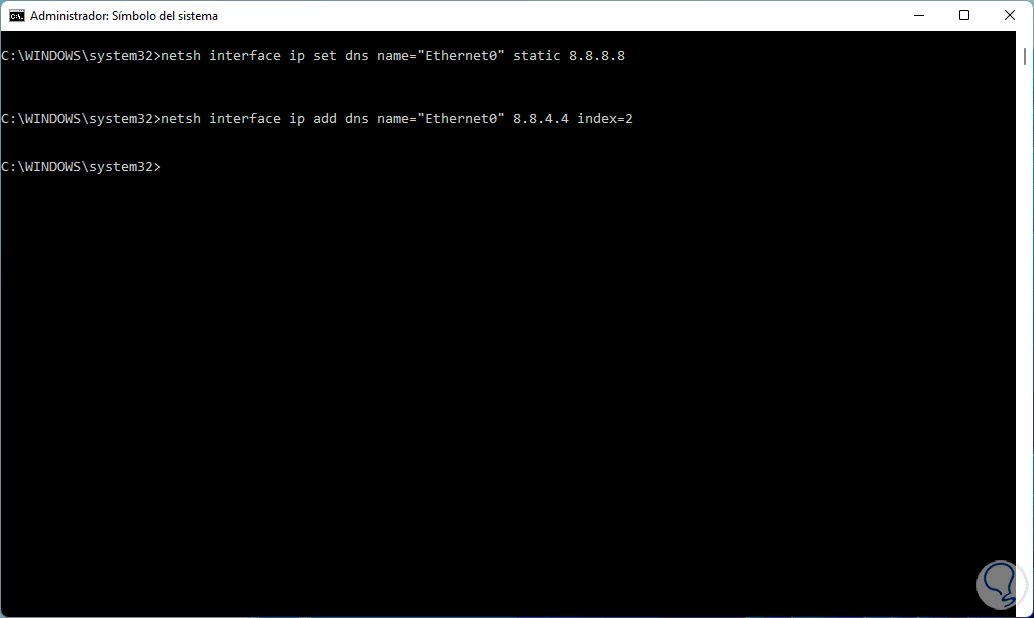 netsh interface ip set dns name="ADAPTADOR" static IP_DNSAlternativamente será posible establecer el DNS secundario con la sintaxis:
