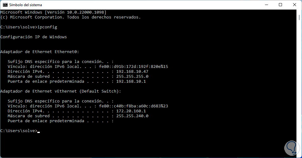 Este es uno de los métodos más simples para asignar nuestra IP estática en Windows 11, para ello en primer lugar abrimos CMD y validamos la IP actual con "ipconfig":