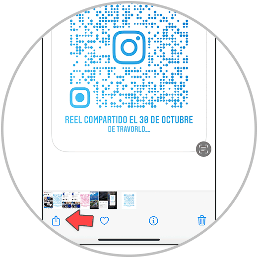 Ahora, entra en la App Fotos en el iPhone. Al entrar encontrarás el código QR generado en el carrete. Pulsa sobre éste para acceder y selecciona el icono de “Compartir”.