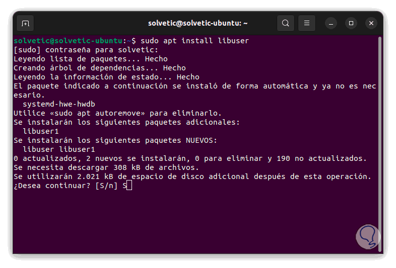Confirmamos la operación ingresando la letra S y esperamos que finalice el proceso.
