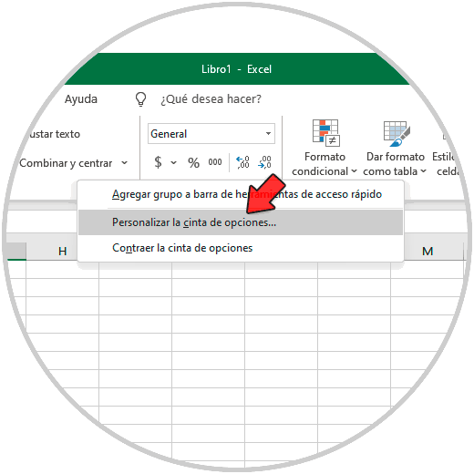 Damos clic en algún lugar de la barra de menús y luego seleccionamos la opción "Personalizar Cinta de opciones":