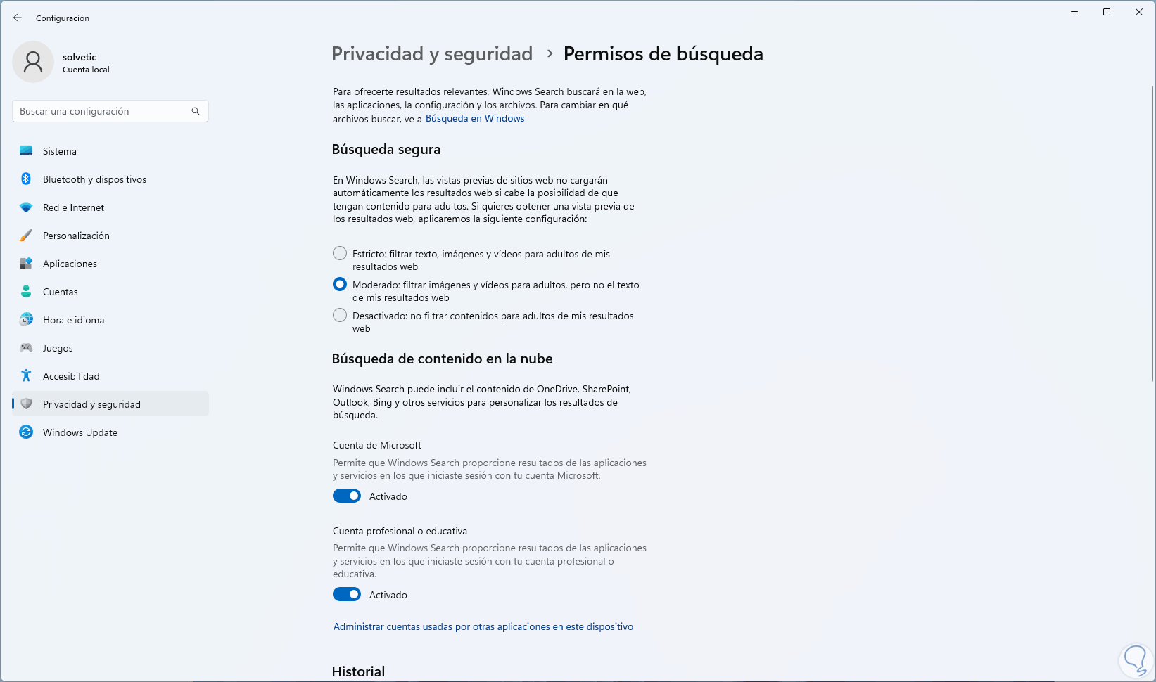 Esta es otra sección que nos entrega diversas opciones de gestión para la búsqueda en Windows 11: