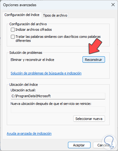 Accedemos a la siguiente ventana. Damos clic en "Reconstruir" para restablecer el índice de la búsqueda y este proceso se hace normalmente cuando las fallas en la búsqueda son repetitivas o son solución, esto hará que todo el índice sea iniciado desde cero por lo cual debemos esperar que el proceso sea completado antes de usar la búsqueda