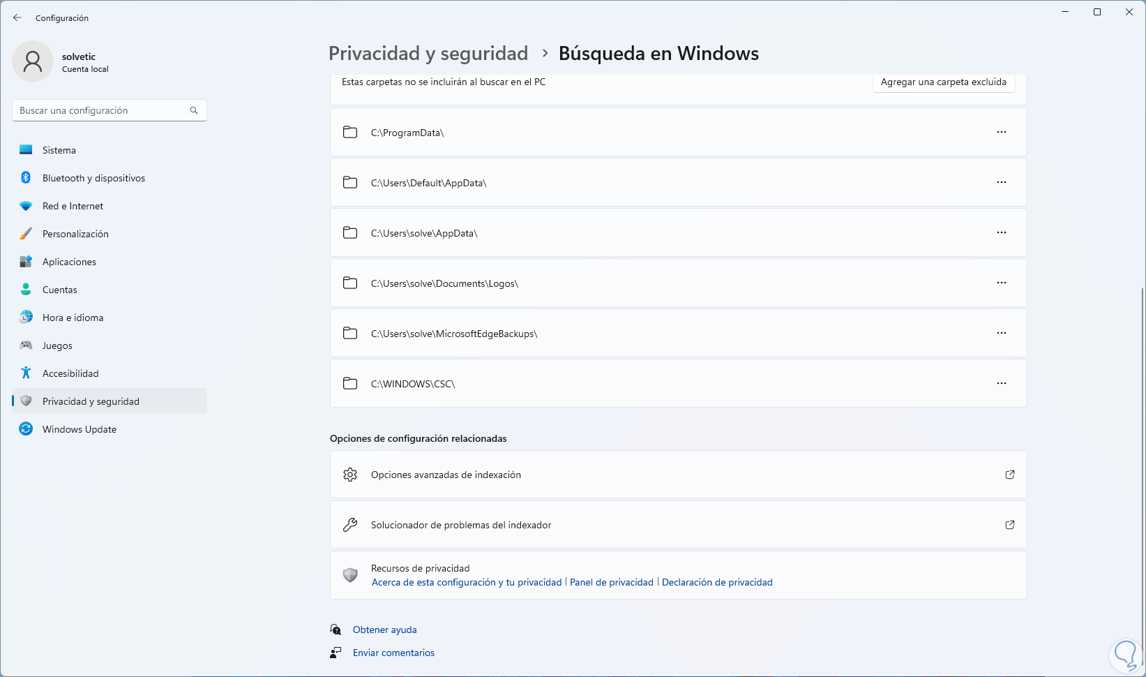 De nuevo en Configuración damos clic en "Solucionador de problemas del indexador":