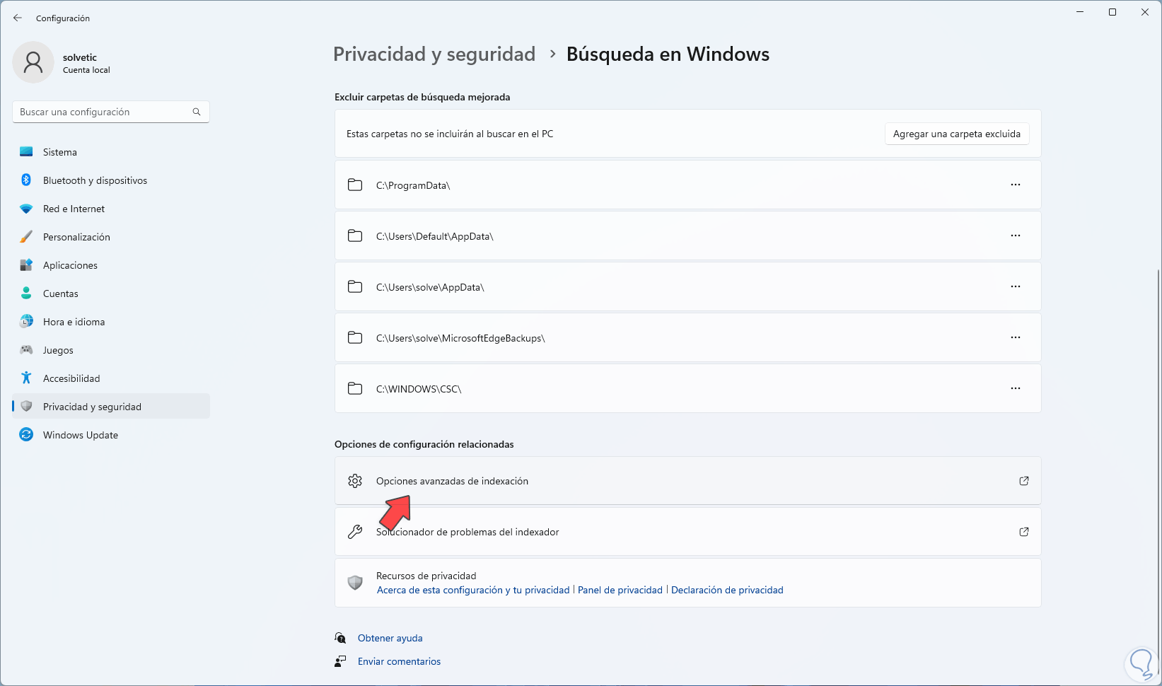 De nuevo en Configuración damos clic en "Opciones avanzadas de indexación":