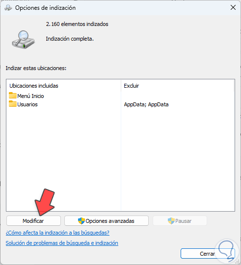 Ahora damos clic en "Opciones avanzadas de indexación":