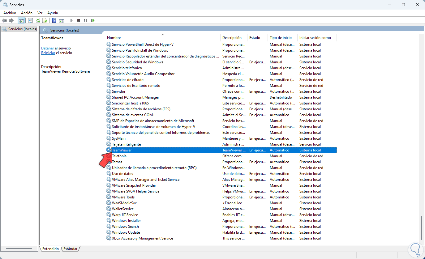 Allí encontramos todos los servicios, damos clic derecho sobre el servicio deseado y seleccionamos "Eliminar":