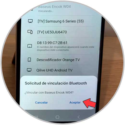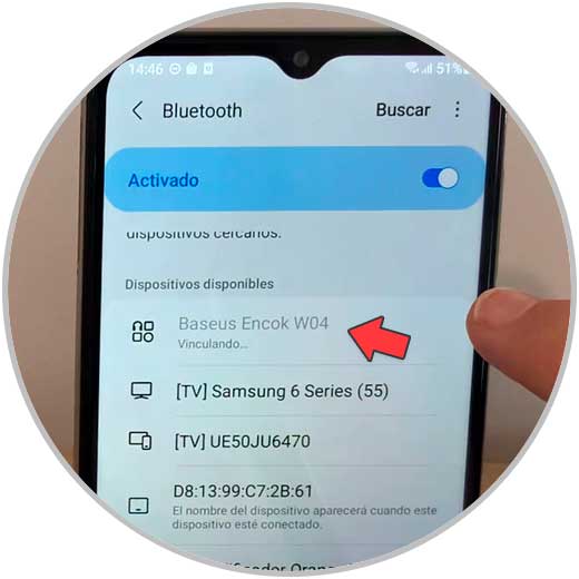 Ahora, la pestaña de Bluetooth debe estar activada, y en el apartado de “Dispositivos disponibles” comenzarán a aparecer dispositivos listos para vincular. Pulsa sobre “Baseus Encock W04” cuando aparezca en el listado.