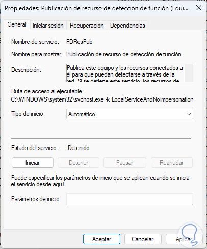 Este servicio “Publicación de recurso de detección de función” se encarga de hacer público el equipo así como los recursos conectados a él con el fin de que sean detectados a través de la red, si este servicio está detenido los recursos de red dejarán de publicarse de modo que será imposible ser detectados por los demás equipos de la red.