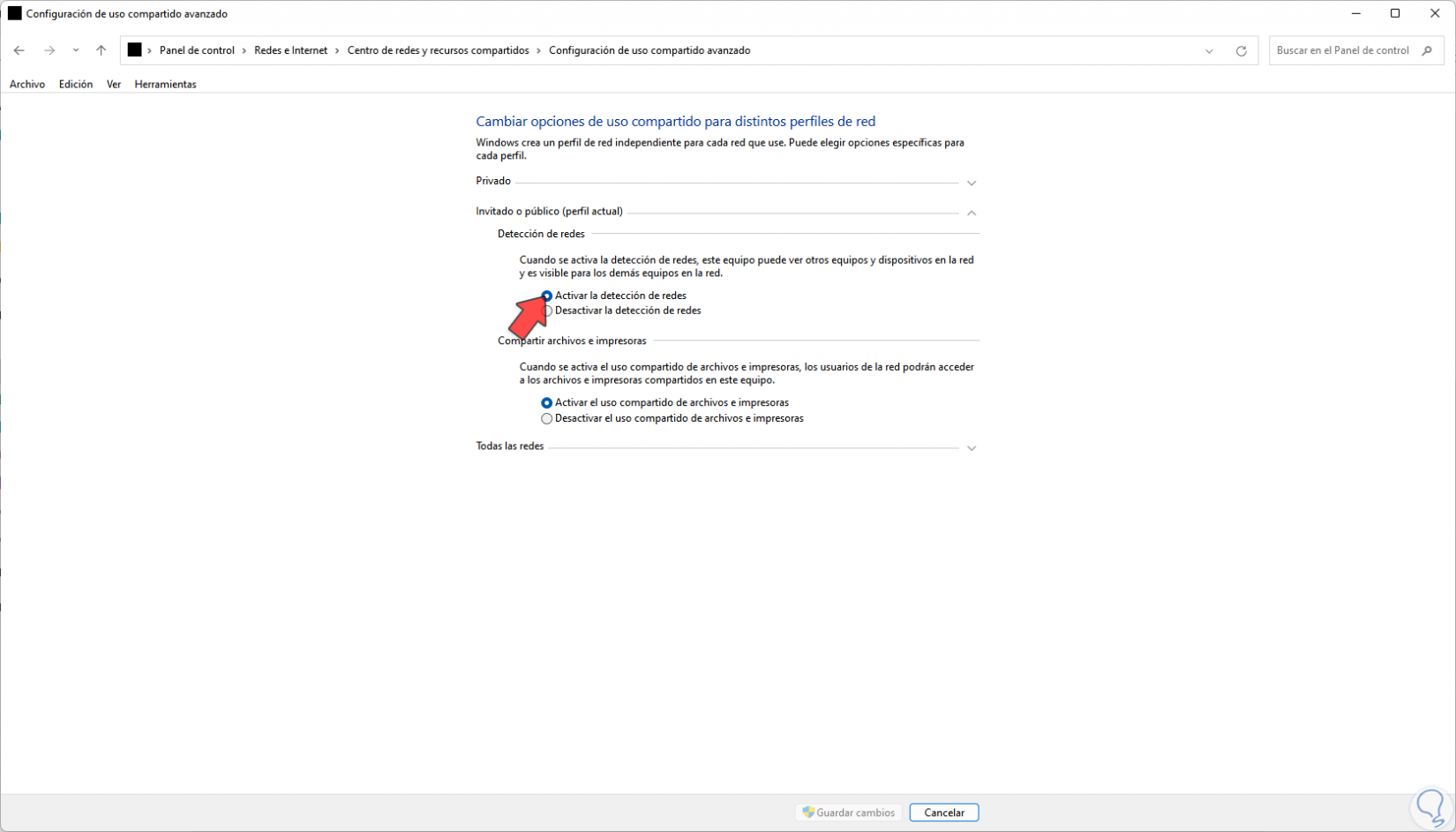 Damos clic en "Cambiar configuración" y validamos que estén activas las casillas de redes en "Detección de redes":
