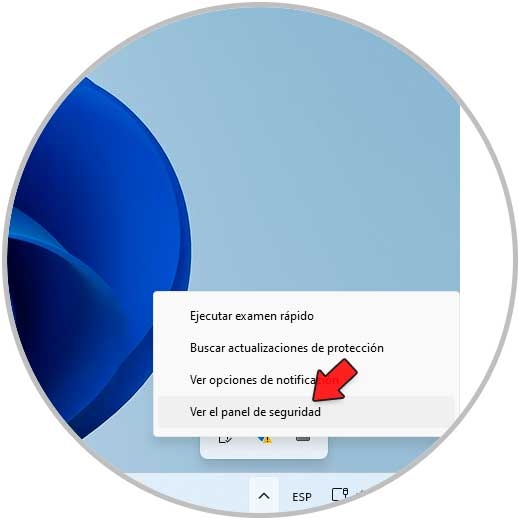 Damos clic en "Mostrar iconos ocultos" en la barra de tareas, luego damos clic derecho sobre el icono de Seguridad de Windows y allí seleccionamos "Ver el panel de seguridad":