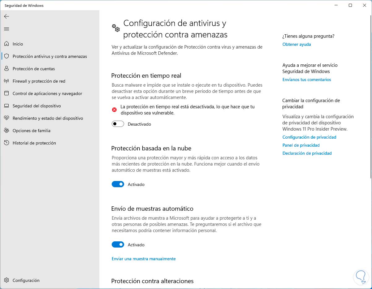 Para desactivar Windows Defender desactivamos el interruptor "Protección en tiempo real" y debemos confirmar el proceso:
