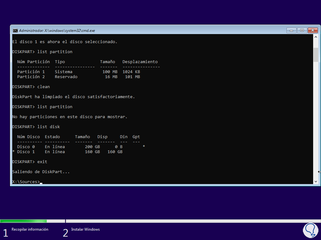 Esto significa que el disco estará listo para instalar Windows. Salimos de Diskpart con "exit":
