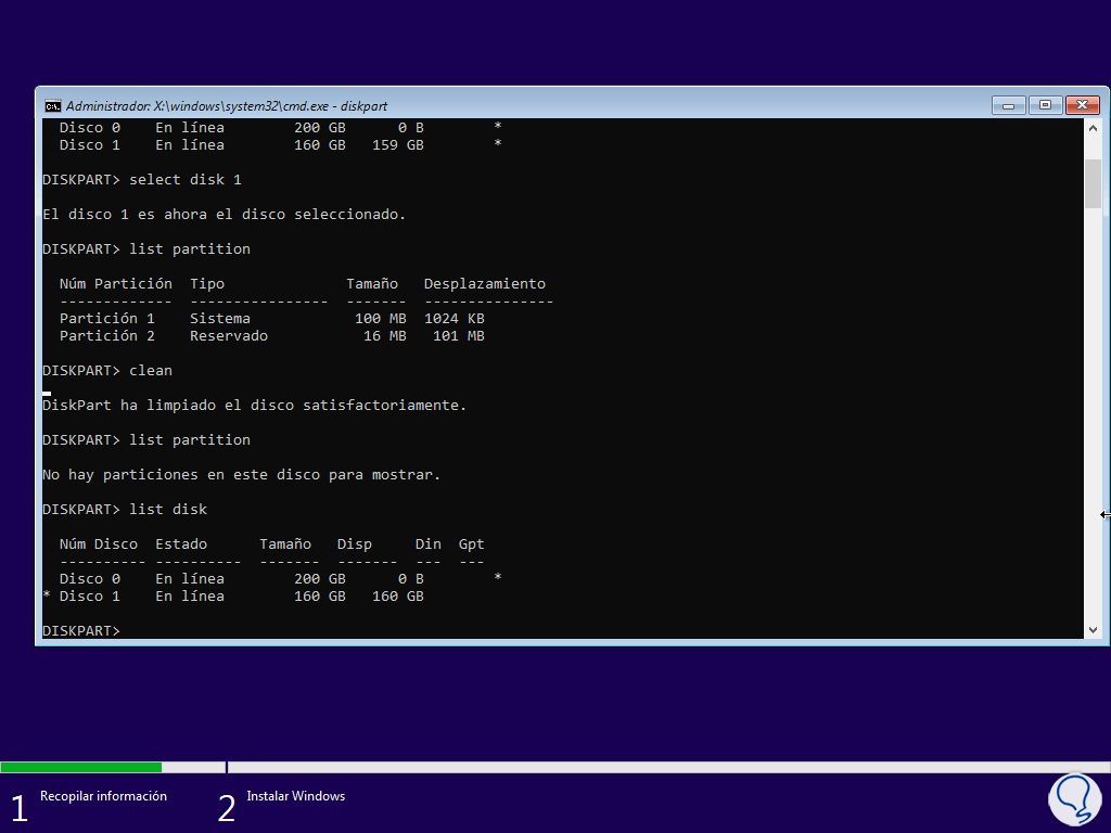 Ejecutamos de nuevo el comando "list partition" para comprobar que se han borrado del disco seleccionado: